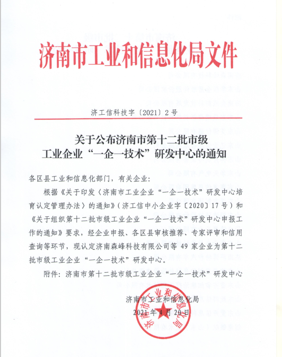 4月20日,濟南市工業(yè)和信息化局官網發(fā)布濟南市第十二批市級工業(yè)企業(yè)“一企一技術”研發(fā)中心名單,山東CA成功獲得認定。