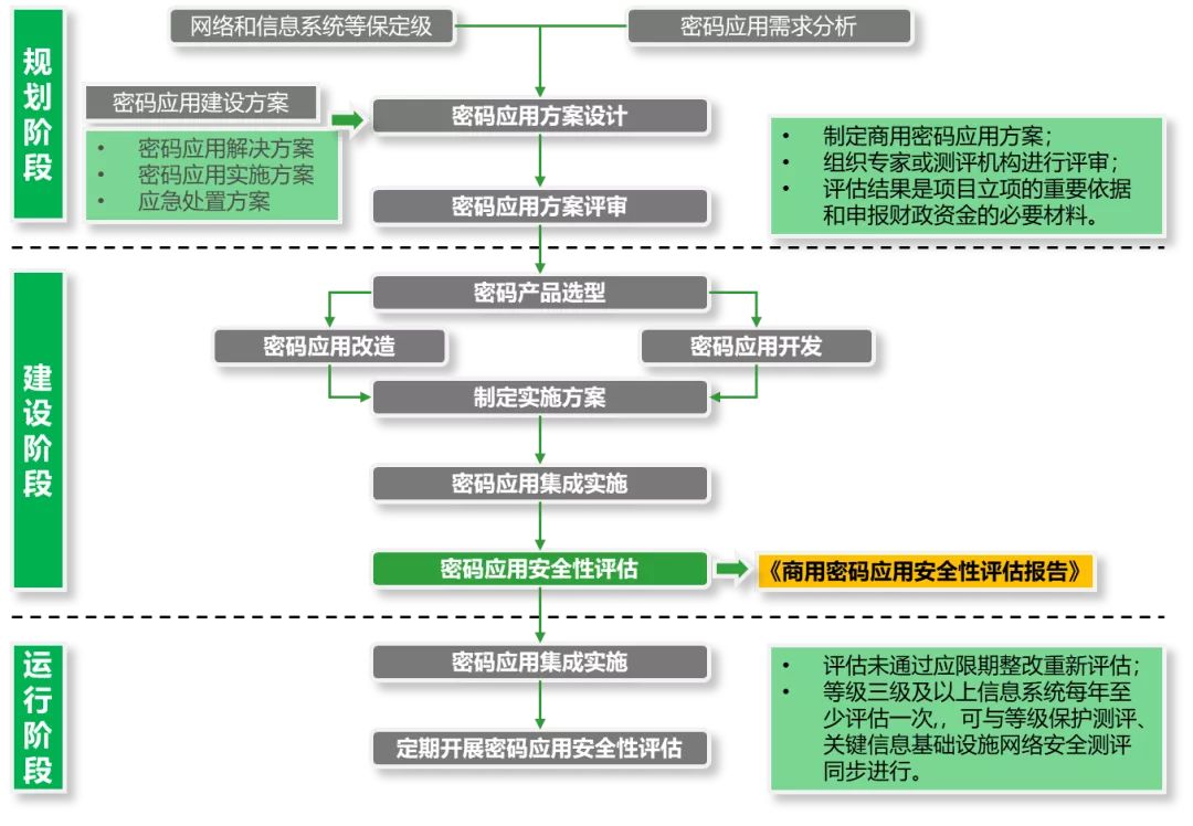 第三級(jí)以上網(wǎng)絡(luò)運(yùn)營(yíng)者應(yīng)在網(wǎng)絡(luò)規(guī)劃、建設(shè)和運(yùn)營(yíng)階段,按照密碼應(yīng)用安全性評(píng)估辦法和相關(guān)標(biāo)準(zhǔn),委托密碼應(yīng)用安全性測(cè)評(píng)機(jī)構(gòu)開(kāi)展密碼應(yīng)用安全性評(píng)估。網(wǎng)絡(luò)通過(guò)評(píng)估后,方可上線運(yùn)行,并在投入運(yùn)行后,每年至少組織一次評(píng)估。密評(píng)結(jié)果應(yīng)當(dāng)報(bào)受理備案的公安機(jī)關(guān)和所在地設(shè)區(qū)市的密碼管理部門備案。