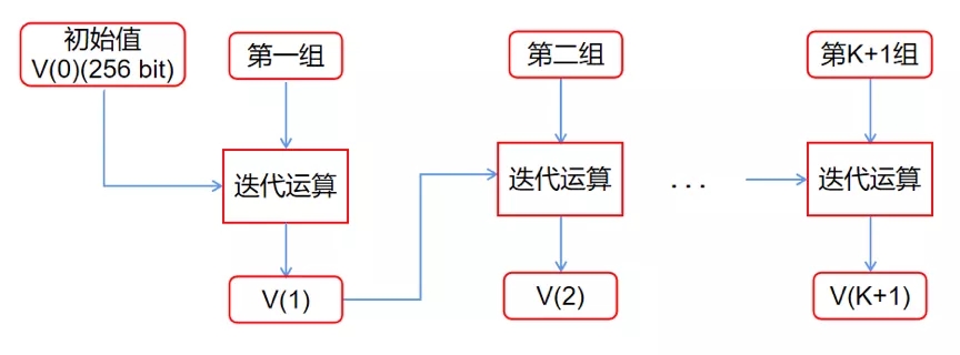 SM3算法的Hash運(yùn)算主要是在壓縮函數(shù)部分,壓縮函數(shù)共包含64輪,每輪包括12步運(yùn)算,64輪循環(huán)計(jì)算結(jié)束后,再將計(jì)算結(jié)果與輸入到本輪計(jì)算的初始數(shù)據(jù)進(jìn)行異或運(yùn)算,即上一次Hash運(yùn)算的Hash值輸出與輸入到本輪計(jì)算的初始數(shù)據(jù)異或得到本次Hash值輸出。