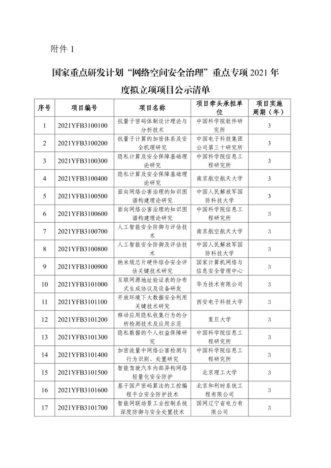 附件:國家重點研發(fā)計劃“網(wǎng)絡(luò)空間安全治理”重點專項2021年度擬立項項目公示清單