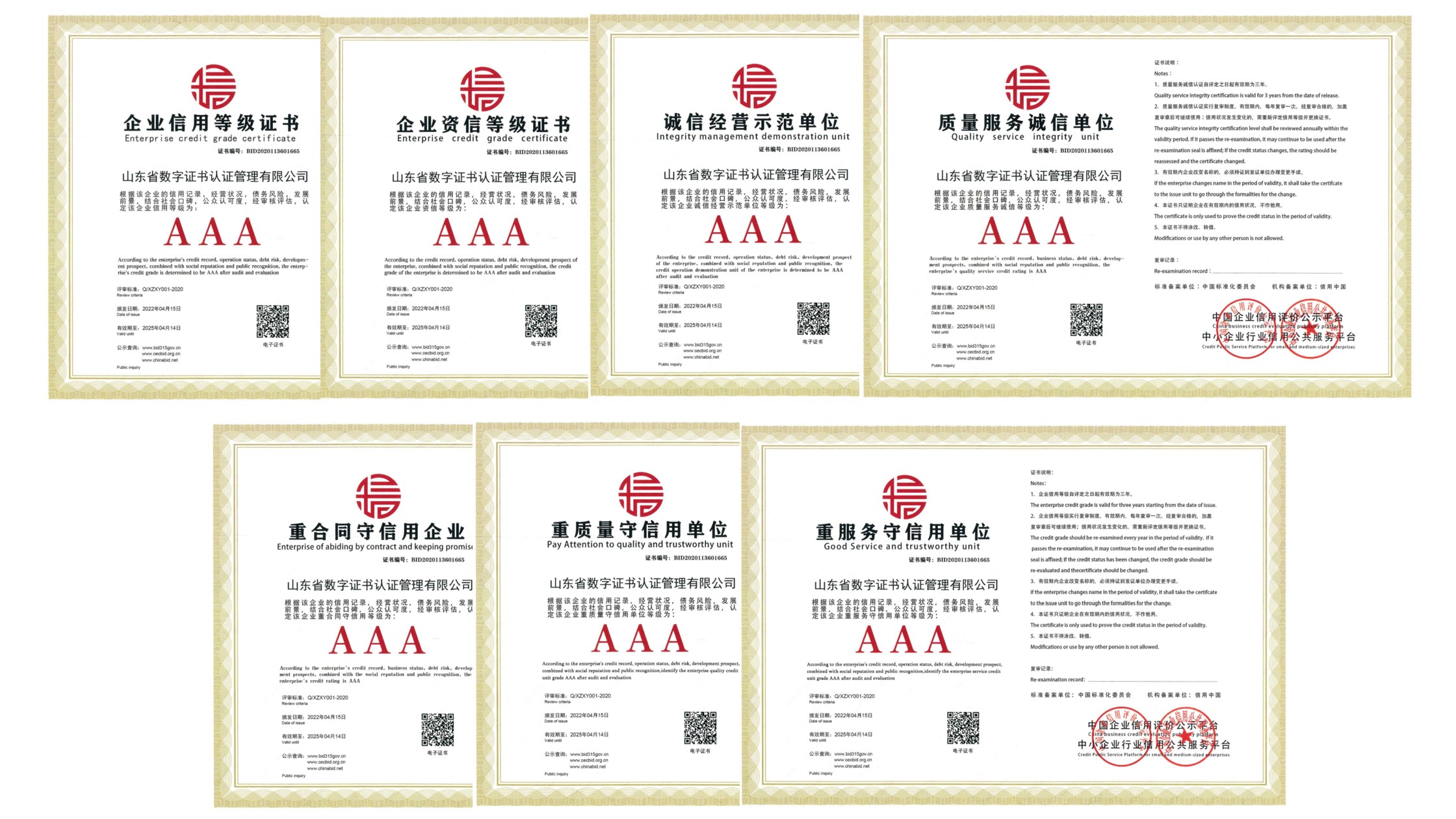 近日,經(jīng)山東CA委托權(quán)威信用評價機構(gòu)依據(jù)Q/JXKC001-2018企業(yè)信用評價標(biāo)準(zhǔn)進行信用評價,從單位經(jīng)營主體、信用制度建設(shè)、從業(yè)基礎(chǔ)、從業(yè)守信、從業(yè)榮譽、從業(yè)業(yè)績和企業(yè)社會責(zé)任等方面進行全方位的評價認(rèn)定,山東CA獲評信用等級為AAA級,誠信管理級別為A,展望為穩(wěn)定。4月15日,中國企業(yè)信用評價公示平臺、中小企業(yè)行業(yè)信用公共服務(wù)平臺聯(lián)合為山東CA頒發(fā)了“企業(yè)信用等級”、“企業(yè)資信等級”、“企業(yè)誠信經(jīng)營示范單位等級”、“企業(yè)質(zhì)量服務(wù)誠信等級”、“企業(yè)重合同守信用等級”、“企業(yè)重質(zhì)量守信用等級”、“企業(yè)重服務(wù)守信用等級”等七項AAA級證書。