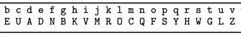 在“移位加密”中,明文到密文的映射是一個由密鑰決定的固定的移位,而在單字母替換加密中,允許映射是任意的,只受一對一的約束。密鑰空間包含字母表的所有雙射或置換。如下圖: