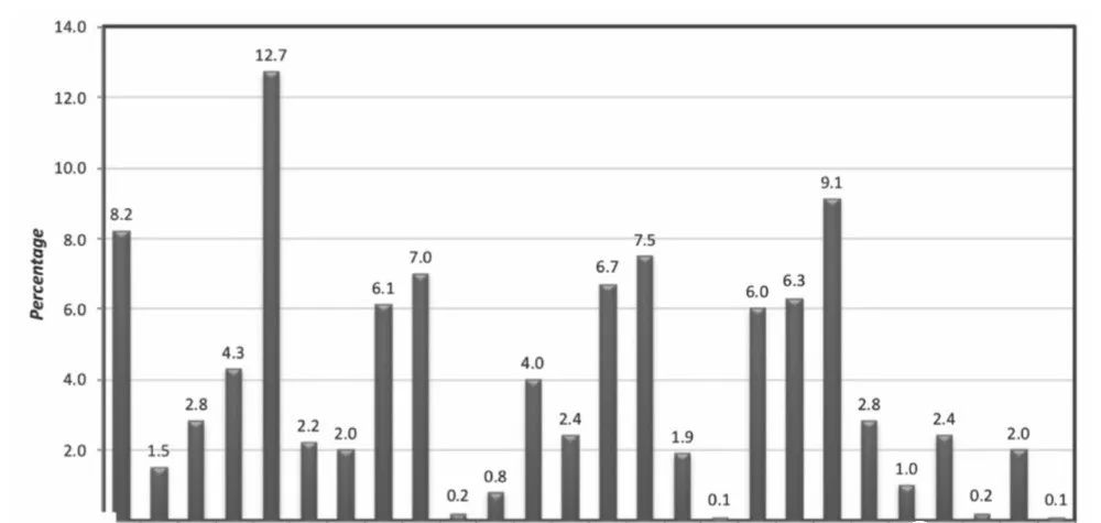 單字母替代加密可以利用英語語言的統(tǒng)計特性進(jìn)行攻擊。由于每一個字母的映射都是固定的,所以,如果得知e映射為D,那么,其余的e都映射為D。英文字母的概率分布如下圖所示: