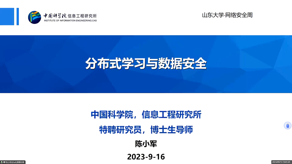 會(huì)議由省商用密碼協(xié)會(huì)會(huì)長(zhǎng),山東大學(xué)徐秋亮教授主持開(kāi)幕。論壇中,首先由劉哲理教授做了題為《安全多方計(jì)算協(xié)議優(yōu)化與安全性評(píng)估》的報(bào)告,介紹典型密文交集運(yùn)算的方案設(shè)計(jì),及其在精準(zhǔn)廣告推薦業(yè)務(wù)中的應(yīng)用;進(jìn)而,介紹以密文集合交集運(yùn)算為基礎(chǔ)協(xié)議的安全應(yīng)用中面臨的安全性問(wèn)題,介紹團(tuán)隊(duì)在集合成員推理攻擊方面的新工作。然后陳小軍研究員做了題為《分布式學(xué)習(xí)與數(shù)據(jù)安全》的報(bào)告,聚焦在分布式學(xué)習(xí)中存在的問(wèn)題,包括聯(lián)邦學(xué)習(xí)的可用性、隱私計(jì)算的效率與數(shù)據(jù)投毒攻擊與防御等,討論相關(guān)研究進(jìn)展。最后,史文征高工做了《加強(qiáng)商用密碼應(yīng)用,筑牢網(wǎng)絡(luò)安全可信基石》的報(bào)告,對(duì)網(wǎng)絡(luò)及密碼安全法律法規(guī)進(jìn)行解讀、對(duì)網(wǎng)絡(luò)安全檢測(cè)評(píng)估及密碼應(yīng)用安全檢測(cè)評(píng)估工作內(nèi)容及要求進(jìn)行解讀、對(duì)密碼應(yīng)用建設(shè)及改造內(nèi)容進(jìn)行講解。最后,山東省密碼管理局商用密碼處王玉華副處長(zhǎng)對(duì)論壇做了總結(jié)發(fā)言。